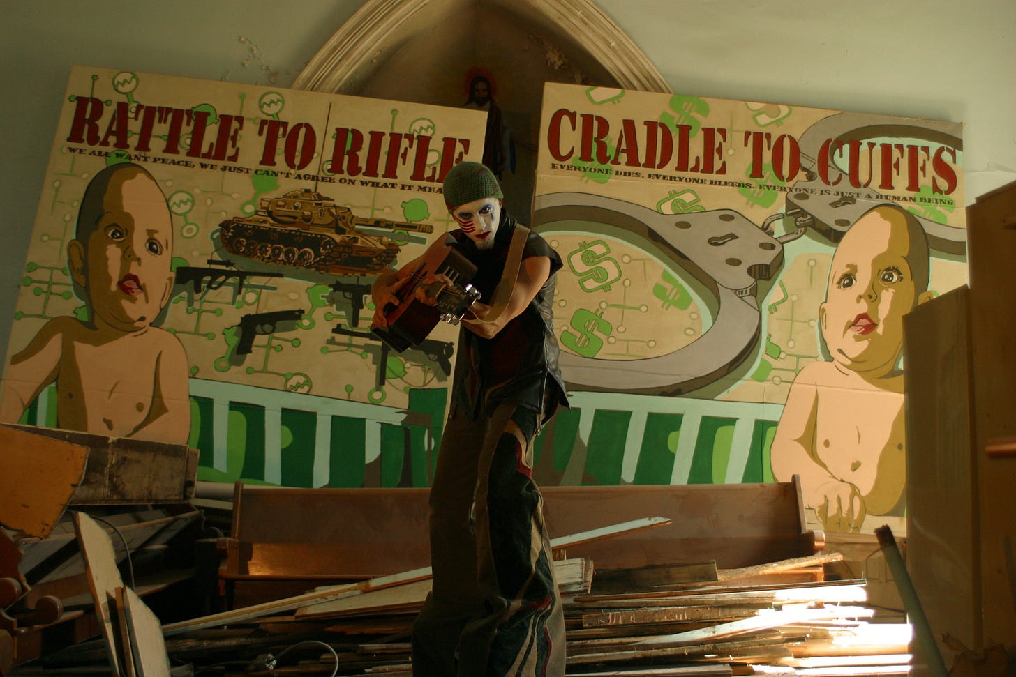 I took it into Berkeley Spring for three sold-out performances. Fog machines, projections, actors, light cues. Driven by the line: “We all want peace, we just can't agree on what it means," I gave voice to the children of war as Jēzum Crow, an eight-foot tall preacher of humanity delivering a musical sermon. I was on stilts every night, puppets circling me, the whole theater vibrating. I had serious talks with people in New York. They wanted to bring it there. For a moment, it felt possible.